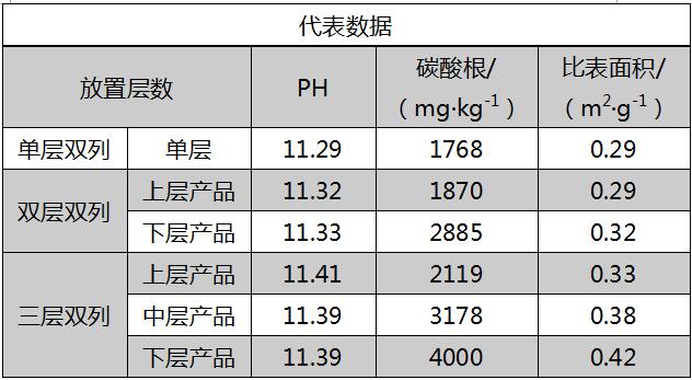 层数不同时,不同层数之间传热速率不同,不同层数物料周围的气氛也不同,物料的反应和煅烧条件有一定的差异,导致不同层数的物料煅烧完毕后的物化性能也不相同。由上表可以看出,随着匣钵层数的增多,上层物料和下层物料的物化性能上也表现出一定的差异,主要表现在材料表面游离锂含量、材料的PH值和比表面积。