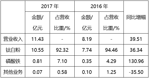 公司主要从事钛白粉产品的生产和销售,主要产品为钛白粉系列产品。公司控股子公司铜陵纳源从事磷酸铁产品的生产和销售,主要产品为磷酸铁系列产品。
