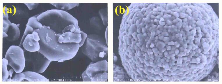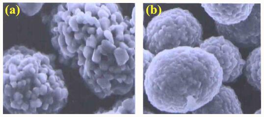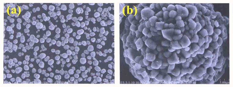 不同形貌的元材料倍率性能不同,疏松多孔的形貌有利于电解液的浸润,缩短锂离子的扩散路径,所以倍率性能好于密实的形貌。疏松多孔的三元材料SEM如图a所示;密实的三元材料SEM如图b 所示。