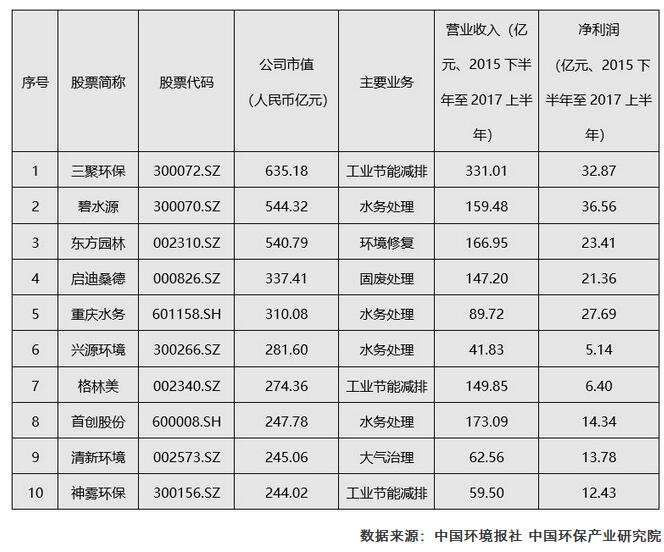 中国粉体网讯 随着我国环保事业和生态文明建设的全面推进,环保产业迎来了快速发展的历史机遇,涌现出一大批优秀的企业,而其中的环保上市企业正是这一领域的领跑者。截至2017年末,我国环保上市公司已超过百家,总市值超过1.1万亿元(人民币),并且继续呈现出良好的发展势头。下面让我们来一同了解市值最高的10大国内环保上市公司(以2017年12月31日作为基准日)。