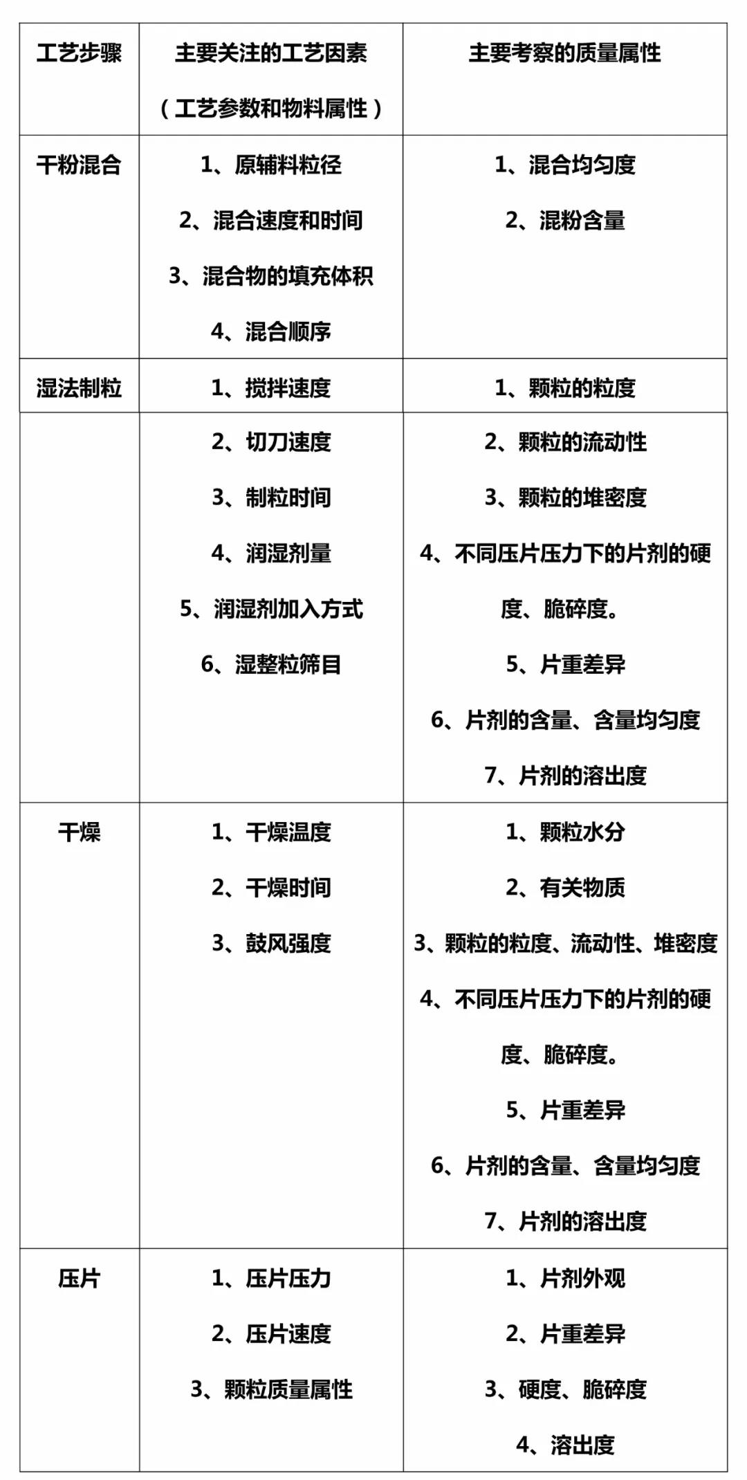 以下列表是湿法制粒工艺开发时各工艺步骤中需考虑的工艺因素和质量属性。