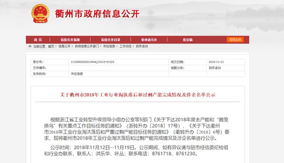 中国粉体网讯 近日,浙江衢州市政府网站发布了关于衢州市2018年工业行业淘汰落后和过剩产能完成情况及涉企名单公示。公示时间为2018年11月12日至11月19日。