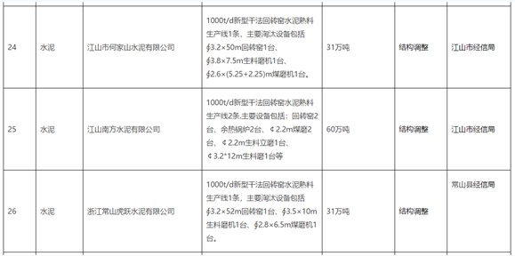水泥行业,江山市何家山水泥有限公司、江山南方水泥有限公司、浙江常山虎跃水泥有限公司、浙江豪龙建材有限公司、浙江青龙山建材有限公司5家企业共183万吨产能被列入名单。(中国粉体网编辑整理/胡一)