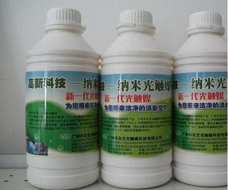 光触媒的主要成分是纳米级TiO2,其氧化能力极强,如果将其喷涂于室内装饰装修材料上,只要有太阳光的作用,表面能释放出活性极强的空穴+电子对,破坏室内空气中的甲醛、苯、氨、TVOC等有害气体的能量链,发生降解反应,还原为无害物质CO2和H2O。