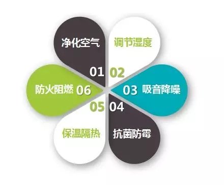 正是由于上述突出的“分子筛”结构,决定了其独特的功能,它具有极强的物理吸附性能和离子交换性能,能净化空气,调节室内湿度、吸附有害气体、吸音降噪,抗菌防霉,保温隔热,防火阻燃,天然环保,色彩柔和等健康环保性能,而且还可以在装饰墙面上制备出不同的肌理、纹路和形状,有非常好的装饰效果。