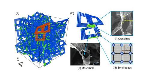 近期,中国科学院合肥物质科学研究院先进制造技术研究所仿生机器人与智能材料实验室研究员王晓杰团队博士潘斗兴与中科院力学研究所博士王超合作,通过细致研究石墨烯泡沫铰链和缺陷的SEM镜像,在准二维石墨片模型基础上,成功构建了一种同时含有本征孔和铰链键的三维孔片网络拓扑模型。他们通过引入铰链键力场参数和孔片比特征几何量,借助粗粒化动力学方法,合理地实现了对拟真实石墨烯泡沫力学行为的有效评估。