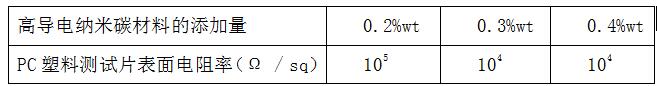 使用目前塑料行业通用的加工工艺,添加少量自制的超分散剂ZT3000,270℃直接熔融共混含石墨烯片层结构超高导电性纳米碳材料粉体和PC塑料粒子,经混炼后加工成厚度1mm测试片,测试其导电性。