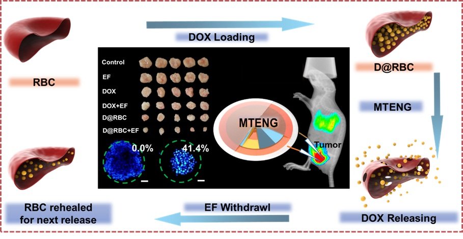 红细胞具有长达120天的体内循环时间,良好的稳定性和伸缩性,无外移植物的免疫原性,是一种很好的肿瘤药物递送载体。同时,载药红细胞可对高压电场刺激产生响应性释放。但传统高压电源设备体积庞大,安全系数低,患者无法自主操作,这些因素阻碍了电场控制式药物递送系统在肿瘤治疗中的应用。