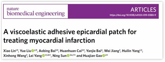 2019年4月15日,苏州大学杨磊教授(现任职河北工业大学)团队,复旦大学孙宁教授团队,与美国布朗大学高华健院士团队合作,在 Nature Biomedical Engineering 杂志在线发表了题为 A viscoelastic adhesive epicardial patch for treating myocardial infarction(一种用于心肌梗死治疗的粘弹性自粘附心肌补片)的研究,在新材料心肌补片开发方面取得重要成果。