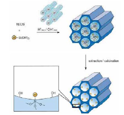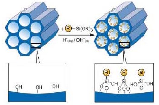 表面化学修饰主要利用偶联剂进行改性。通过含有机官能团的偶联剂与介孔二氧化硅材料作用,将功能官能团以共价键方式嫁接到介孔材料孔壁上,实现介孔二氧化硅材料的功能化。常用的表面化学修饰方法有两种:共缩聚法和后嫁接法。