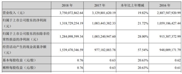 三环集团2018年度业绩报告显示:报告期内,公司实现营业收入37.50亿元,比上年同期增长19.82%;营业利润15.45亿元,比上年同期增长22.84%;归属于母公司所有者的净利润13.19亿元,比上年同期增长21.72%,主要原因是公司抓住成长时机,把握行业发展红利,调整市场经营策略,提高产品竞争优势,电子元件及材料等产品销售额明显增长。
