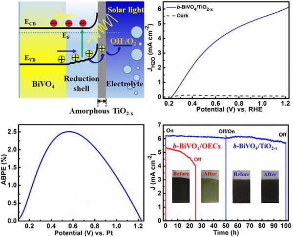 近日,中国科学院上海硅酸盐研究所与北京大学、复旦大学合作,在BiVO4基光阳极的设计及其在光电催化裂解水的应用研究中取得新进展。研究团队采用典型制备纳米结构BiVO4光阳极的方法,并以氢等离子体还原技术在室温下制备了还原态的黑色纳米结构BiVO4光阳极。黑色纳米结构BiVO4光阳极不仅可以提高电荷传输和分离效率,而且大大拓展了其可见光的吸收谱域(带隙缩小了0.3 eV),但该黑色纳米结构BiVO4光阳极表面催化效率并没有得到显著提高,且稳定性不佳。另外,采用传统的产氧催化剂(OEC)负载使得光阳极和催化剂之间的电荷复合非常严重。为此,该团队通过进一步的实验设计,采用ALD技术在纳米结构的BiVO4光阳极表面负载无定形的TiO2,再进一步还原。EELS结果表明,这种负载TiO2的BiVO4在还原的过程中,自身同样获得了和黑色纳米结构BiVO4相同的还原程度,而无形的TiO2被还原成了无定形的TiO2-x。这种无定形TiO2-x包覆的还原态BiVO4 (b- BiVO4/TiO2-x)光阳极的电荷传输和分离特性与黑色纳米结构BiVO4光阳极的特性基本一致。最终的b- BiVO4/TiO2-x光阳极可以实现在低电压下获得比较高的电流密度(3.85 mA cm-2 at 0.6 VRHE),因此,该光阳极取得了2.5%的偏压转化效率(ABPE)。进一步研究发现,无定形的TiO2-x不仅充当了OEC催化剂的作用,而且还起到了稳定还原态BiVO4光阳极的作用,从而实现了b- BiVO4/TiO2-x光阳极长久稳定高效的水的裂解。相关研究成果以Novel black-BiVO4/TiO2-x Photoanode with Enhanced Photon Absorption and Charge Separation for Efficient and Stable Solar Water Splitting 为题发表于国际期刊《先进能源材料》(Advanced Energy Materials 2019(DOI: 10.1002/aenm.201901287),上海硅酸盐所博士田章留和复旦大学博士研究生张鹏飞为共同第一作者,上海硅酸盐所研究员黄富强和中科院院士、复旦大学教授赵东元为共同通讯作者。