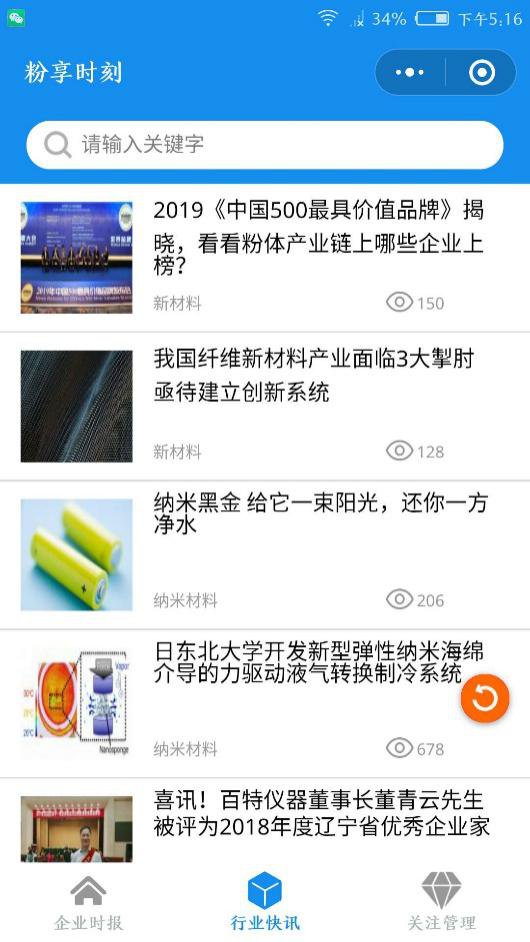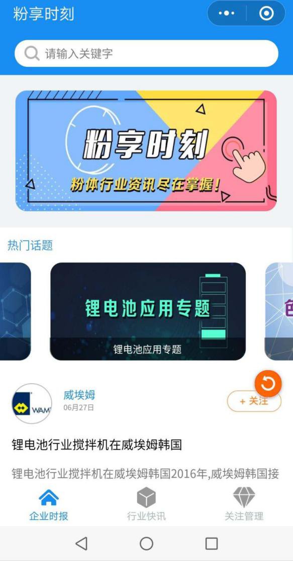 打开“粉享时刻”小程序,我们可以看到里面有“企业时报”和“行业快讯”两大栏目,粉体行业资讯、企业动态可以一览无余,同时您也可以在关注管理版块里选择您所关注的行业与企业,小程序会根据关键词智能推送您想了解的资讯。