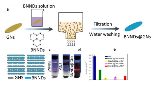 图1(a)BNNDs在石墨烯表面的沉积过程,(b)BNNDs@GNs复合片,(c)BNNDs及石墨烯的分散行为,(d)改性石墨烯聚合物涂层的屏蔽性
