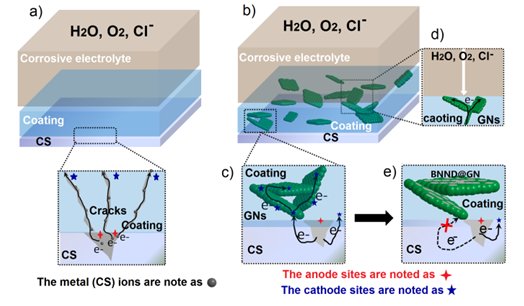 图2 不同涂层体系的腐蚀机理:(a)纯环氧涂层,(b-e)改性前后的石墨烯/环氧涂层