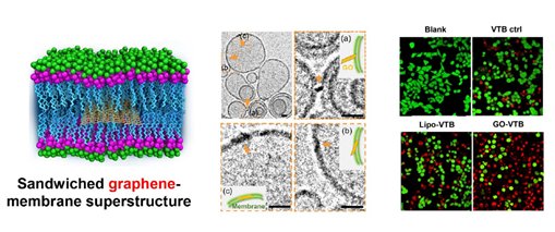 墨烯-生物膜“三明治”超级结构及其在药物递送中的潜在应用。(左)模拟图;(中)冷冻透射照片;(右)膜间递送药物(GO-VTB)的优势结果