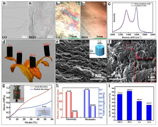 图:各向异性“孔洞石墨烯”气凝胶基本表征:氧化石墨烯片层的透射电镜照片(a1)及氧化石墨烯液晶的偏光显微镜照片(b1),孔洞氧化石墨烯片层的透射电镜照片(a2)及氧化石墨烯液晶的偏光显微镜照片(b2),氧化石墨烯及孔洞氧化石墨烯片层的拉曼光谱(c),各向异性“孔洞石墨烯”气凝胶的光学照片(d)、扫描电镜照片(e,f)、力学(g)、电学(h)及比表面积数据(i)。