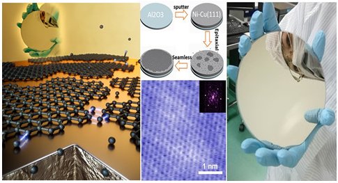 左图:石墨烯单晶晶圆生长设计及实验结果;右图:低温制备的6英寸石墨烯单晶晶圆