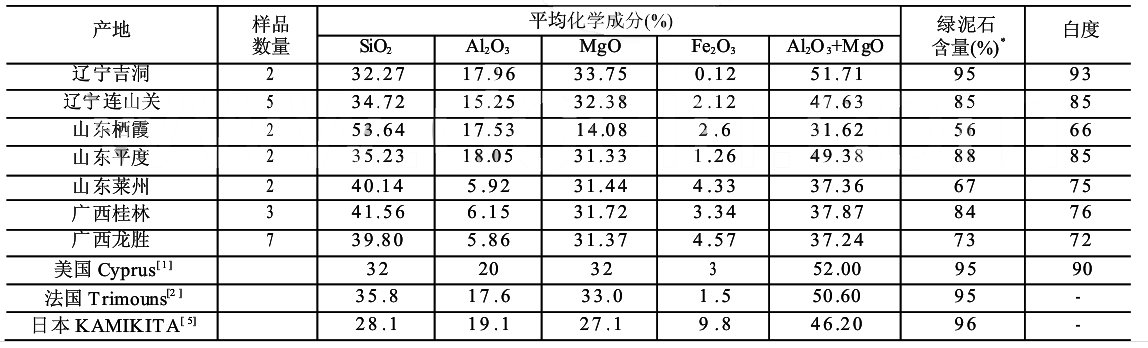 不同产地绿泥石矿石性能