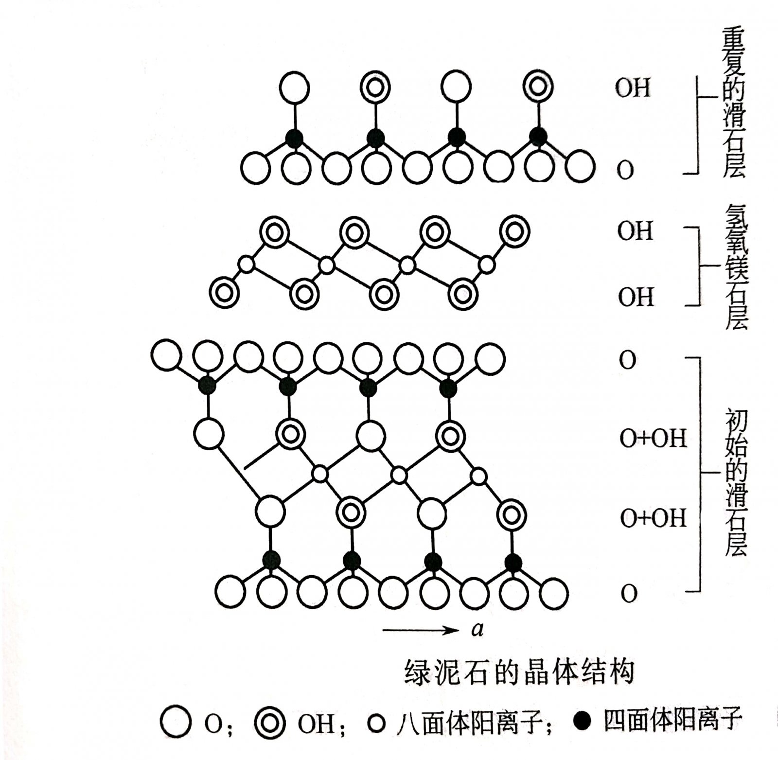 绿泥石的晶体结构是由滑石层和氢氧镁石层作为基本结构层交替排列而成的三层结构。滑石层中的二层[SiO4]四面体层的活性氧相对排列,并彼此沿a轴错动a/3距离,中间所形成的八面体空隙层为阳离子Mg、Fe、Al所充填。[SiO4]四面体层并不形成规则的正六方网,因为[SiO4]基底的氧朝向相邻氢氧镁石层中最近的OH转动一个角度(平均5°~6°),而距滑石层和氢氧镁石层中的阳离子较远,因而使六方网层成为复三方网层,使绿泥石的对称降低为单斜或三斜。