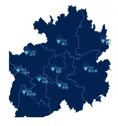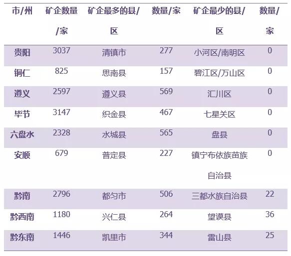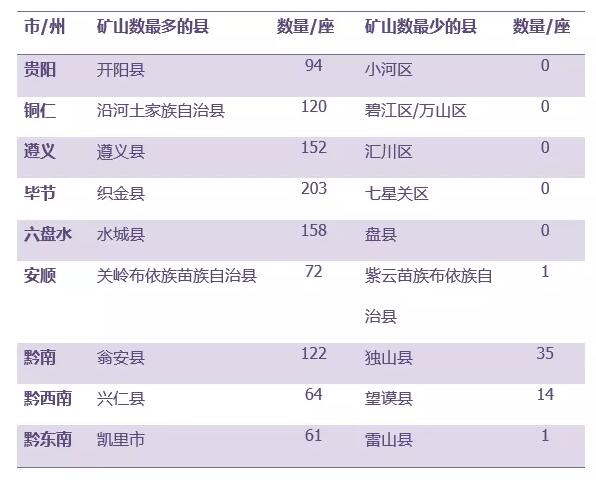 贵州省位于中国西南方向,有贵阳、铜仁、遵义、毕节、六盘水、安顺、黔南、黔西南和黔东南9个市(州),其中贵阳共有矿山数316座、铜仁共有535座、遵义共有715座、毕节共有1202座、六盘水共有465座、安顺共有390座、黔南共有745座、黔西南共有369座和黔东南共有397座,共计5144座。其中毕节的矿山数量与其他市相比是最多的。
