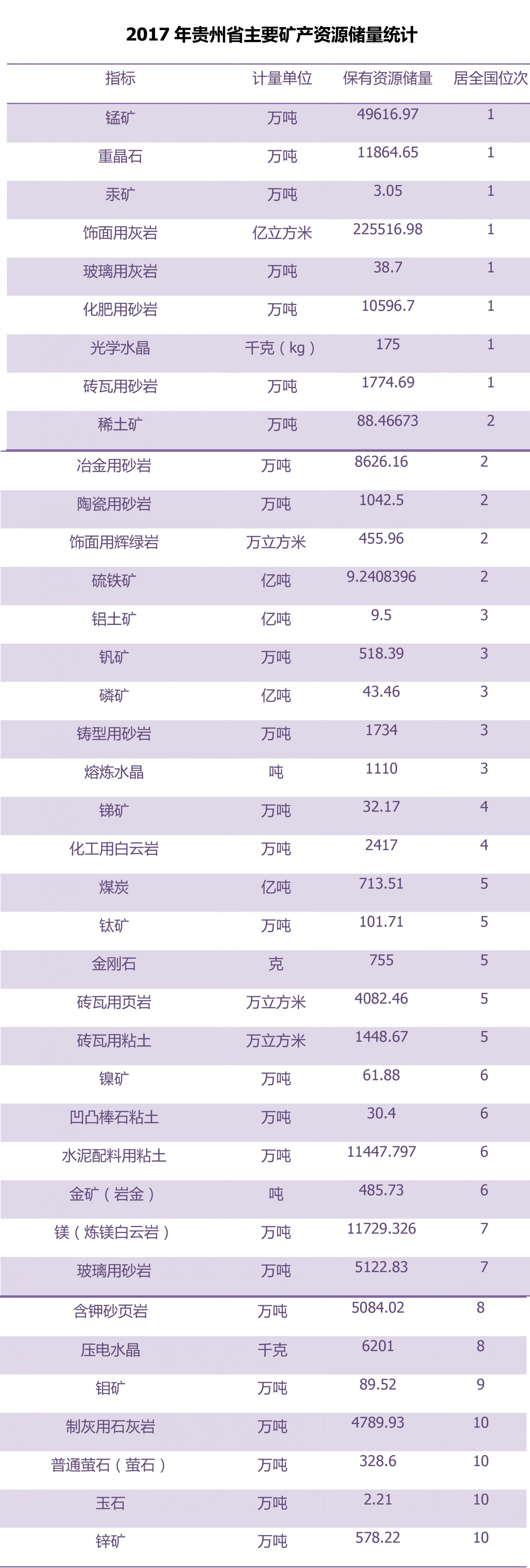 贵州矿产丰富,但由于成矿地质条件的限制,部分矿产短缺。