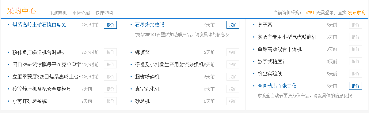 粉体展特推出采购中心栏目,作为设备采购方,无需登录,直接发布求购需求;没有收费,您的采购需求直接面向厂家;实时发布,面向本网5万+入驻厂家;您的优质求购内容更会第一时间被推送到与之匹配的相关厂商,简单高效、富有效率。