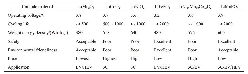 在目前所报道的一系列正极材料中,LiMnPO4正极材料具有4.1V的高电位,比LiFePO4提高0.7V,且处于现有电解液的稳定电化学窗口。据相似的放电比容量和压实密度测算,LiMnPO4电池的能量密度较LiFePO4提高约20%,达190Wh·kg-1,且LiMnPO4价格更便宜。与锰酸锂相比,LiMnPO4具有相近的工作电压,但能量密度更高、高温循环寿命更长。与三元材料相比,LiMnPO4具有相似的能量密度,但更安全、价格更低。