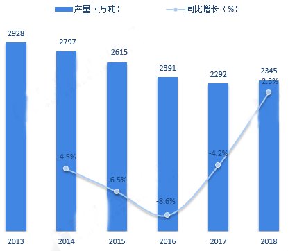 根据工信部数据统计,2018年,全国耐火材料产量2345.22万吨,同比增长2.30%。2019年上半年,全国耐火材料产量为911.12万吨,同比降低3.62%。