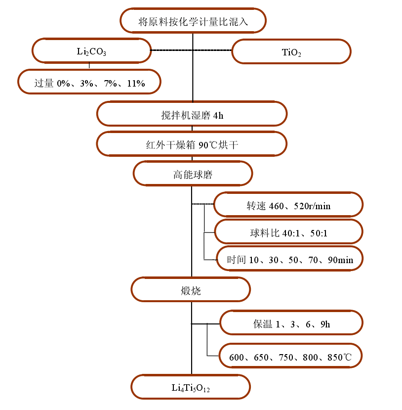 锂钛氧化物是电池负极材料研究的一个热点。尖晶石型Li4Ti5O12的制备方法,主要有固相反应法、溶胶—凝胶法,从工业化实现角度考虑,固相反应法最有可能被采用。刘盛林研究了一种采用高能球磨法用途制备锂钛氧化物的方法,主要包括湿法预磨、高能球磨制备前躯体、高温合成Li4Ti5O12等,具体流程如下:
