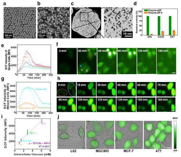 该剂型能够克服细胞膜屏障,将酶分子高效递送进细胞中,同时利用纳米颗粒的保护作用,保证酶分子的天然活性,进一步借助无定形态金属有机骨架的介孔结构(3-6 nm,晶态结构仅1 nm),强化底物和产物的传质扩散(图1 a-d)。基于上述优势,该剂型可用于细胞内代谢产物的原位检测。