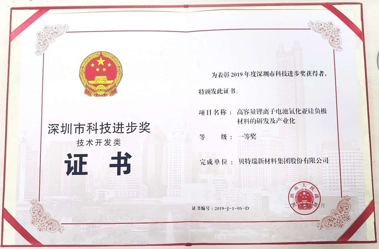 深圳市科学技术奖是深圳市科技创新的最高荣誉,该奖项是贝特瑞集团继2018年度获得中国专利优秀奖之后的又一次重量级奖项,进一步体现了贝特瑞的科技创新精神,同时也是贝特瑞自主研发实力提升的一次重大成果展示。