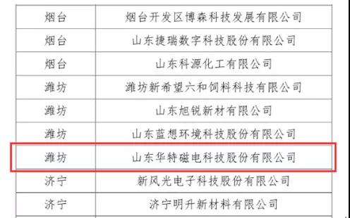 近日,根据《关于印发〈山东省瞪羚企业认定培育和奖励行动计划(2017-2019)〉的通知》和《关于开展2019年度山东省瞪羚企业、独角兽企业认定和培育工作的通知》,山东省工业和信息化厅发布了拟认定141家第三批瞪羚企业名单,潍坊仅4家企业入围,山东华特磁电科技股份有限公司荣耀上榜!