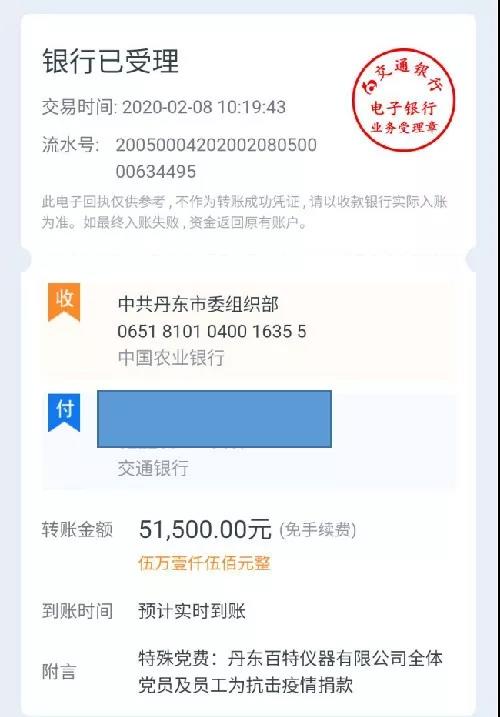 2月8日上午,丹东百特党支部将凝聚着33名党员和136名员工拳拳爱国之心的51500元的特殊党费汇到中共丹东市委组织部。市委组织部领导称赞百特是“爱党爱国的典范,抗击疫情的榜样”。