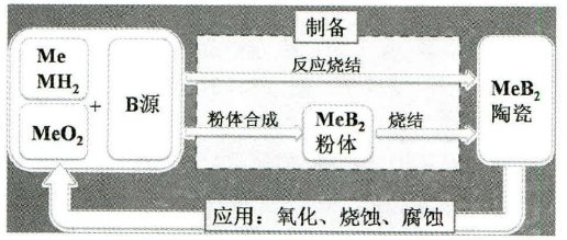UHTCs的生命周期一般包括两个阶段:制备和应用。以硼化物UHTCs为例,在制备阶段,以过渡金属氧化物或过渡金属和硼源化合物为原料,利用化学反应合成过渡金属硼化物粉体。然后采用无压、热压或放电等离子烧结等方法将硼化物粉体制备成块体材料。在应用阶段,在由高温、反应气氛、载荷、烧蚀等因素所构成的极端环境下工作时,MeB2又易被氧化分解。