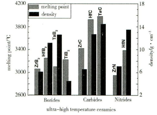 超高温陶瓷若想要在航空航天领域广泛应用必须具有较高熔点和较低密度。在众多材料中,过渡金属硼化物、碳化物和氮化物符合这一要求,它们的熔点都在3000℃以上,其中ZrB2陶瓷密度可低至6.12g/cm3。