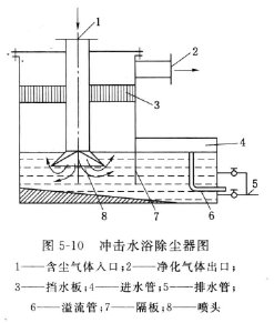 加速冲击式除尘器的工作原理是,含尘气流由进气管喷入水中,在管的出口处设有一个圆锥体,以增加冲入水中的速度。管口距水面高2~3mm。气流连同激起的水花在通过挡板时脱出,由排气口排出。进口管风速10m/s,阻力1500~4000Pa。这种冲击式除尘器的耗水量约0.15kg/m3。