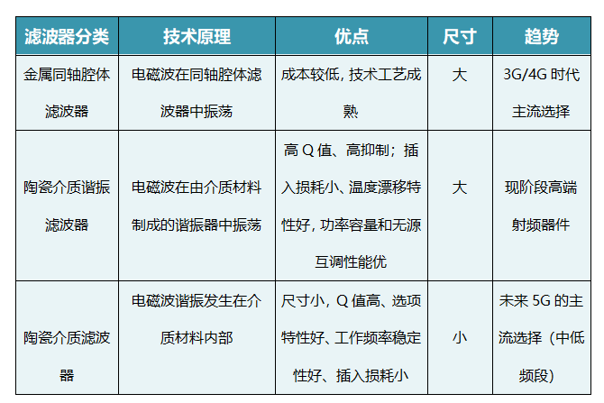 滤波器是基站射频核心部件,其主要部件是使发送和接收信号中特定的频率成分通过,而极大地衰减其他频率成分。基站滤波器主要有金属同轴腔体、陶瓷介质谐振和陶瓷介质三类。随着5G技术的发展,陶瓷介质滤波器逐步替代金属腔体滤波器成为主流。