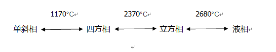 ZrO2有三种晶体结构,单斜相(常温稳定型,密度5.68g/cm3)、四方相(密度6.1g/cm3)、立方相(密度6.27g/cm3)。三种晶型可以相互转变,转变温度与杂质含量有关,在ZrO2纯度高时,三种晶型能发生以下同质异晶转变: