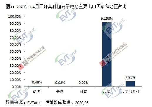 EVTank发布的报告显示,2020年1-4月,国轩高科出口的电池中,动力电池占比达到99.5%,2019年占比较高的储能电池在2020年1-4月基本没有,而12V的汽车启动电池依然占据少许的市场份额。