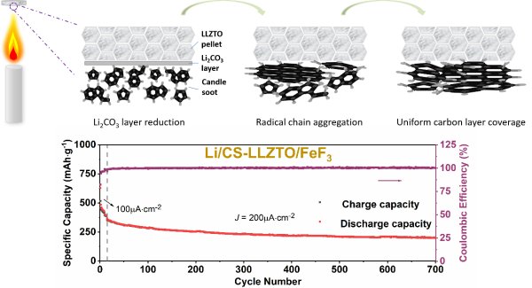 该团队提出“烛焰(candle soot)烧烤陶瓷”模式改性LLZO/Li界面的策略,显著剪薄了陶瓷表面的钝化层,实现了“转换型”锂氟化物固态电池的超长可逆循环。LLZO在与空气接触后,易与空气中的水和二氧化碳反应,在表面形成包含LiOH和Li2CO3的钝化层,这一钝化层严重影响了Li与LLZO的接触,阻断了界面处的锂离子传输通道,导致电池的界面阻抗过大,电池性能严重受限。因此,钝化层的去除是目前LLZO/Li界面改性研究的重要方向之一。在此背景下,该团队提出一种简易的蜡烛火焰气相沉积手段,在蜡烛燃烧产生的高温环境下,LLZO表面的Li2CO3钝化层可以被表面沉积的蜡烛煤烟还原,具有多晶石墨化结构的煤烟炭黑层在锂化后可生成LiC6晶域,具有离子/电子混合导电性,有利于锂离子流在界面中间层的高通量传输。这种界面改性后的Li/CS-LLZO/FeF3固态电池表现出优异的长循环和倍率性能,其初始可逆容量可达500 mAh·g-1,循环寿命长达至少1500圈,在200 μA·cm-2电流密度下循环700圈后的可逆容量依然维持在201.0 mAh·g-1。陶瓷基固态Li-FeF3电池的循环性能甚至可超过文献报道的液态Li-FeF3体系。相关成果发表于ACS Applied Materials & Interfaces。