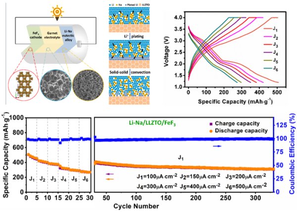 Li-Na/LLZO/FeF3固态电池构架,共晶合金固-固对流示意图,Li-Na/LLZO/FeF3电池的倍率和循环性能