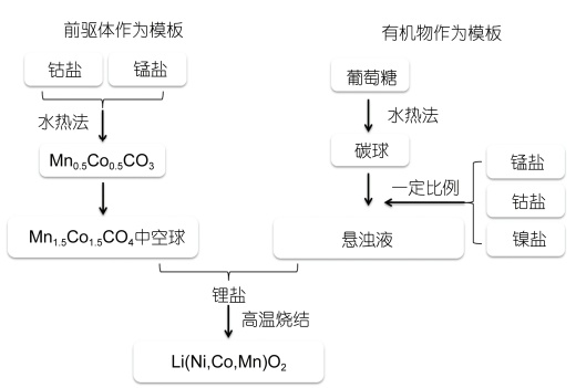 模板法指采用具有一定形貌或是结构的前驱体物质,通过拓扑效应使最终产物能够将模板剂形貌继承并保持下来,是一种常见的制备具有一定形貌三元正极材料的方法。