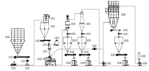 其工作原理是:将经过温控加药系统精确计量过的表面改性剂通过特制的雾化喷嘴被送至雾化室,让表面改性剂与干燥的粉体物料在雾化室进行混合。若使用固体状改性剂,改性剂会先在温控加药系统内被加热融化至液态。表面改性剂与被改性的粉体物料先进入雾化室进行混合,接着自动连续地进入钉盘内,受到盘内不同方向的气流冲击,高速旋转的转子让特殊设计的钉盘内形成涡旋二相流,让物料和改性剂被充分打散。依靠转子高速旋转与粉体物料的冲击、剪切和摩擦作用所产生的热量,粉体和改性剂在盘内迅速升温,达到改性需要的温度,也因此让两者得以充分接触、混合,改性剂能迅速、均匀地与粉体颗粒表面作用,包覆于颗粒表面,完成对粉体的表面包覆改性。接着然后改性后的粉体成品进入后端的气流分级机系统进行分选,合格的细粉将会被选到旁边的旋风集粉器进行冷却和收集。