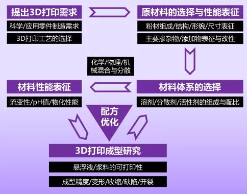 针对不同3D打印工艺和应用场景需求,开发各种性能稳定且打印质量可靠的材料。研究所目前主要集中在有机物高分子、各类复合陶瓷悬浮液/浆料材料等方面的研究。总体材料开发和配制路线方案为: