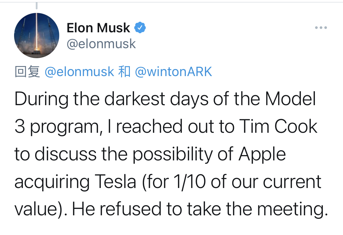 马斯克在推特中说道:在Model3项目最黑暗的时刻,我曾去找蒂姆•库克讨论苹果收购特斯拉的可能性(作价是当今市值的1/10,约600亿美元),但是库克拒绝了这场会面。
