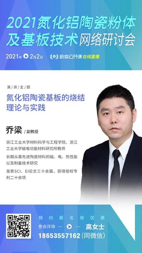 为促进氮化铝陶瓷基板产业技术的发展,中国粉体网旗下粉体公开课平台将于2021年2月2日举办首届“2021氮化铝陶瓷粉体及基板技术网络研讨会”。为企业管理、技术人员提供一个深度交流、深入思考、磨炼内功、强化自身的平台。来自浙江工业大学的乔梁副教授将走进粉体公开课的直播间,给大家带来题为《氮化铝陶瓷基板的烧结理论与实践》的报告。届时,乔梁副教授将简要介绍氮化铝陶瓷基板的制备工艺流程,然后从氮化铝陶瓷的导热机制、烧结机理与烧结实践等方面详细介绍高热导率氮化铝陶瓷基板烧结中的工艺控制原理。