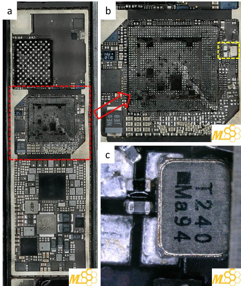 图1: 由iPad mini拆解下来的石英晶体,T240 Ma94。a-c为iPad mini板子上局部放大的光学显微镜照片。