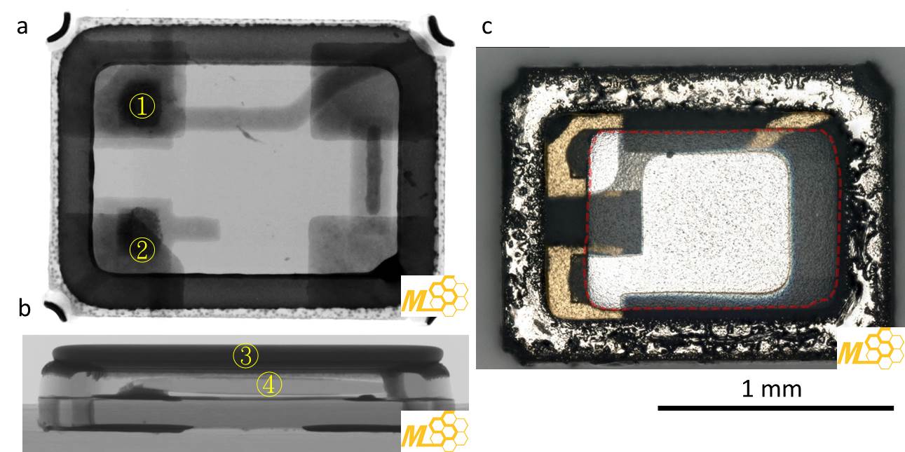 图2a与 b为石英晶体未开盖之前的平面与截面的X-ray照片,由照片可以清楚看到石英晶体(④)一侧连接着电极(①&②),另一侧则是悬空,图2c为开盖后的光学显微镜照片,红色虚线为本次分析的石英晶体。