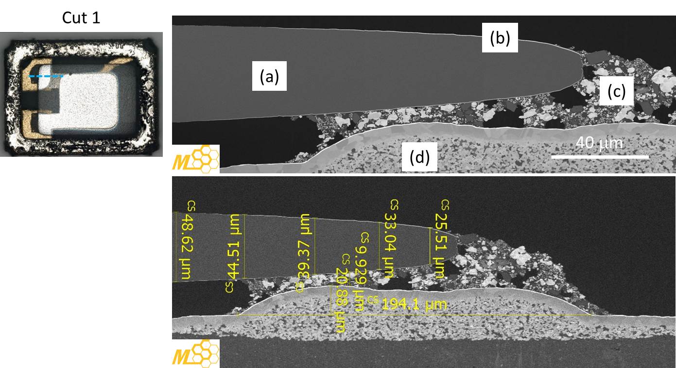 图3: 右上图为Cut 1(天空色虚线)的PFIB结果,(a)为石英晶体,(b)为石英晶体表面的金属薄膜,(c)为银胶,(d)为封装基材。校正后的相关尺寸标示于右下图。